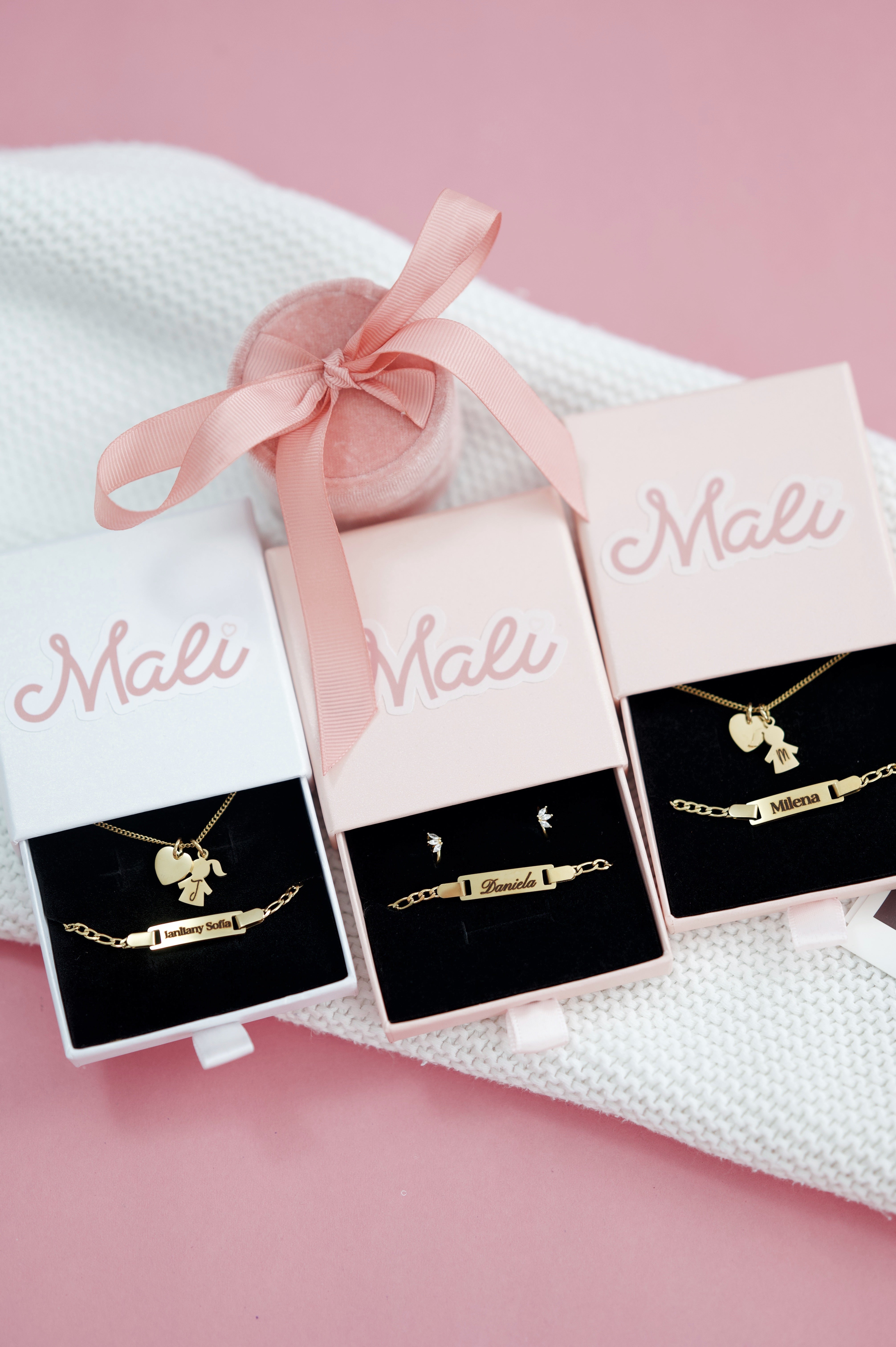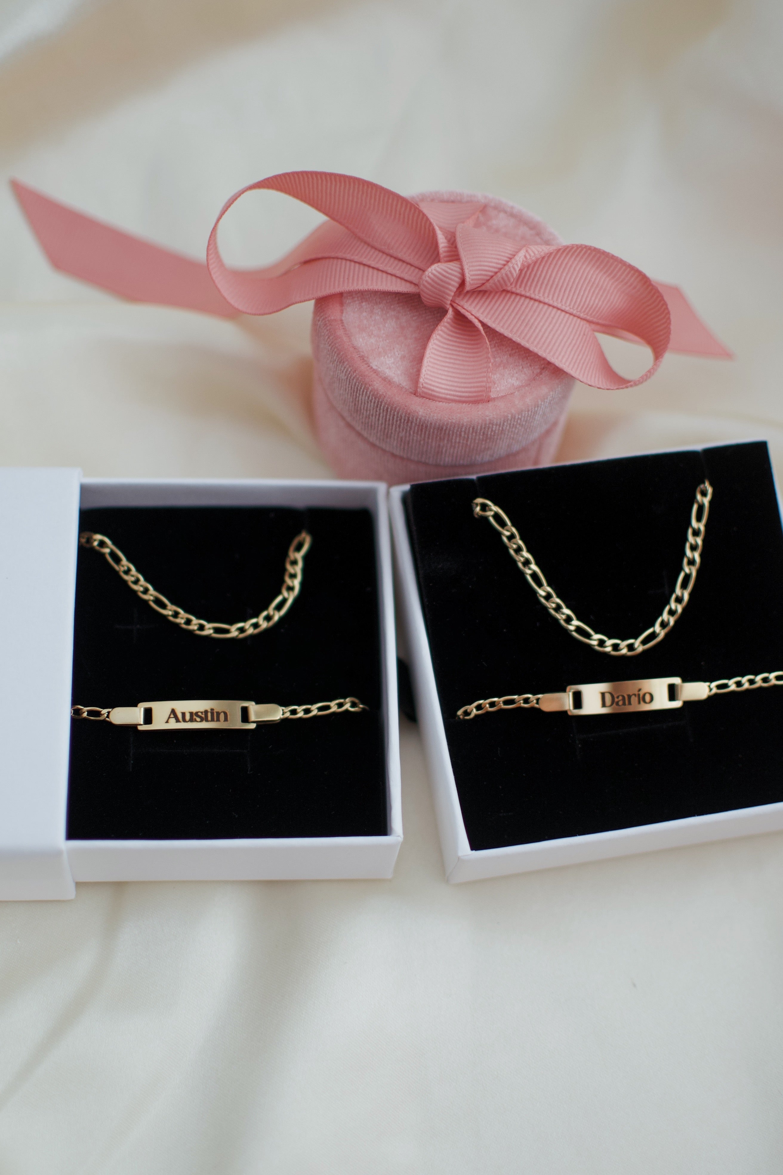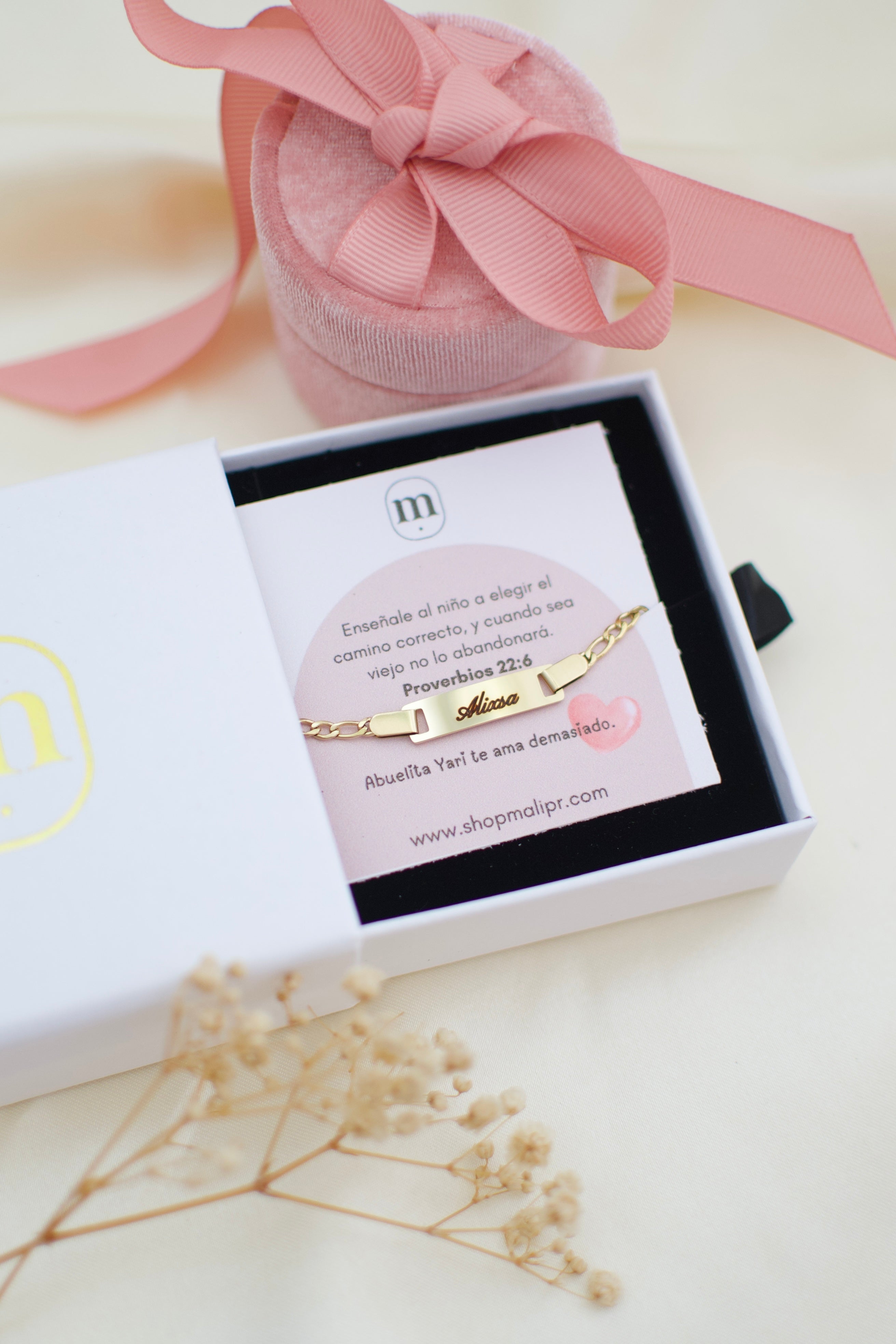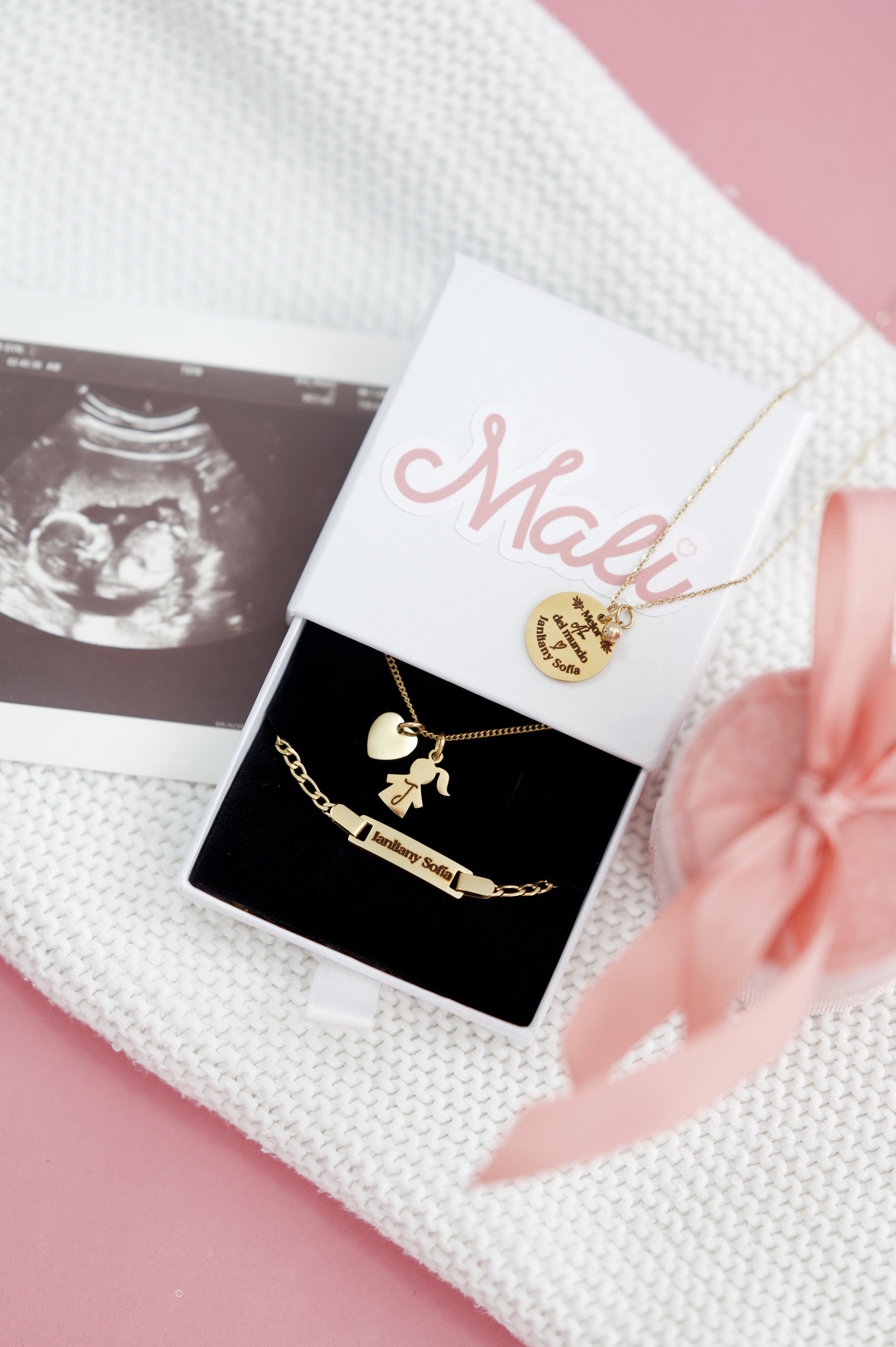 Incluye la pulserita de Bebé grabada (nombre de bebé), y un collar personalizarlo con charms de niña o niño, cada uno representando a los pequeños que llenan tu vida de felicidad. Incluye corazón. Puedes agregar un estuche personalizado con el nombre del bebé por un costo adicional ($2.99) 🤍 ¡Perfecto para guardar la pulsera del bebé!