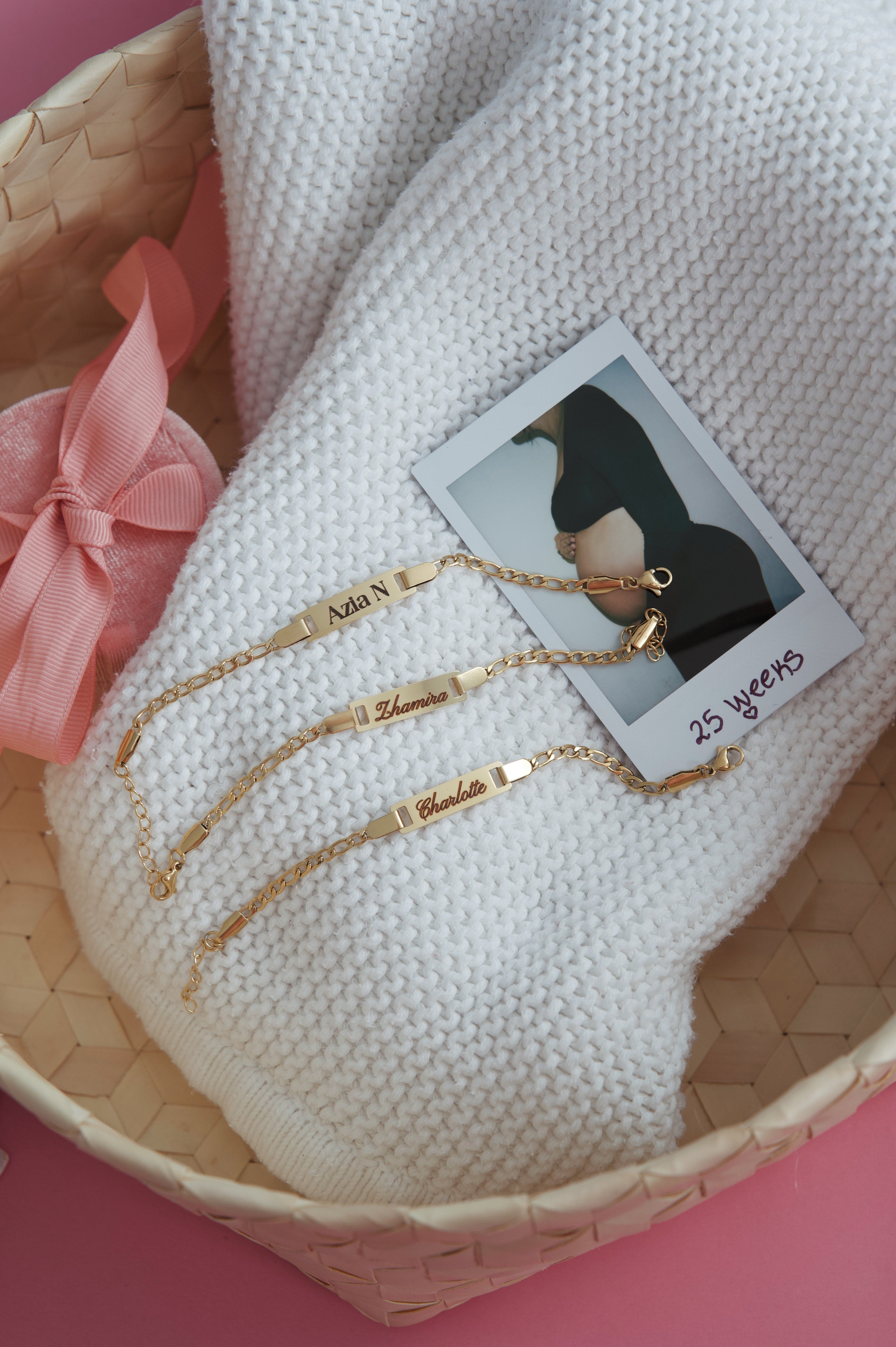 Incluye la pulserita de Bebé grabada (nombre de bebé), y un collar personalizarlo con charms de niña o niño, cada uno representando a los pequeños que llenan tu vida de felicidad. Incluye corazón. Puedes agregar un estuche personalizado con el nombre del bebé por un costo adicional ($2.99) 🤍 ¡Perfecto para guardar la pulsera del bebé!